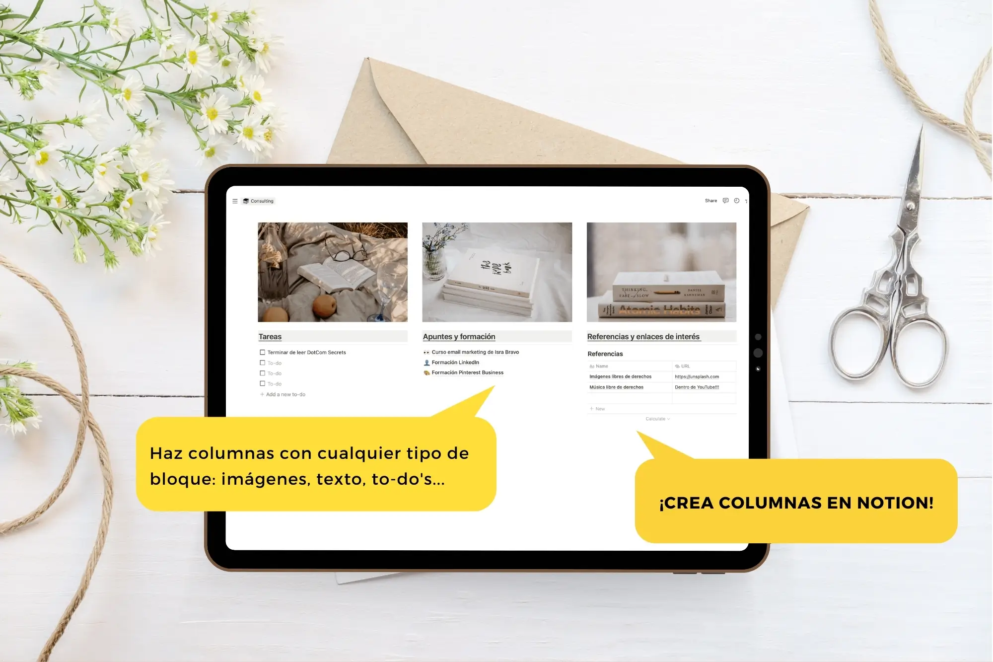 - Esto no solo vale para bloques de texto. Puedes crear columnas con cualquier bloque de Notion: imágenes, enlaces, páginas, tablas, calendarios...